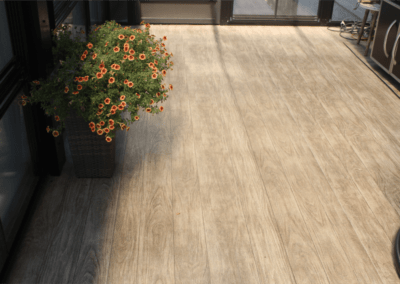 Clear polycarbonate roof allows light and heat through, so the room doesn’t feel confined but protects from rain and snow. Vinyl plank flooring is both functional and gorgeous to look at.