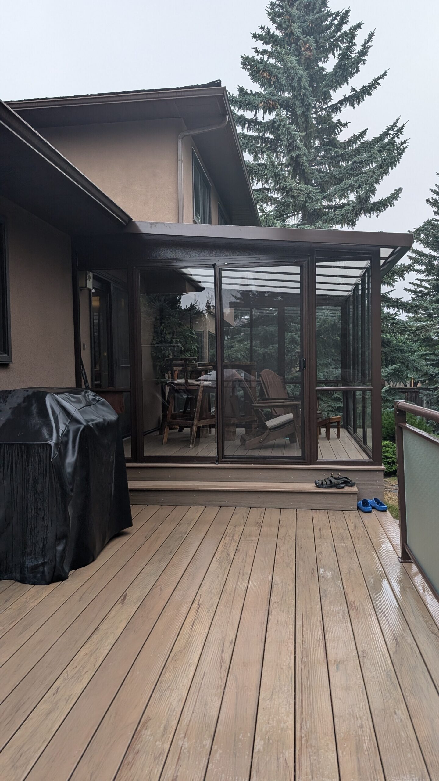 Check out this deck and sunroom upgrade. It is a fantastic addition to this NW Calgary home,  featuring floor to ceiling glass panels. It’s a stylish room with an uncompromised view and plenty of sunlight. The acrylic roof panels provide UV protection and add an ambiance to the room.