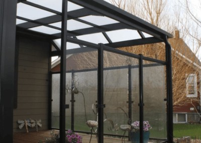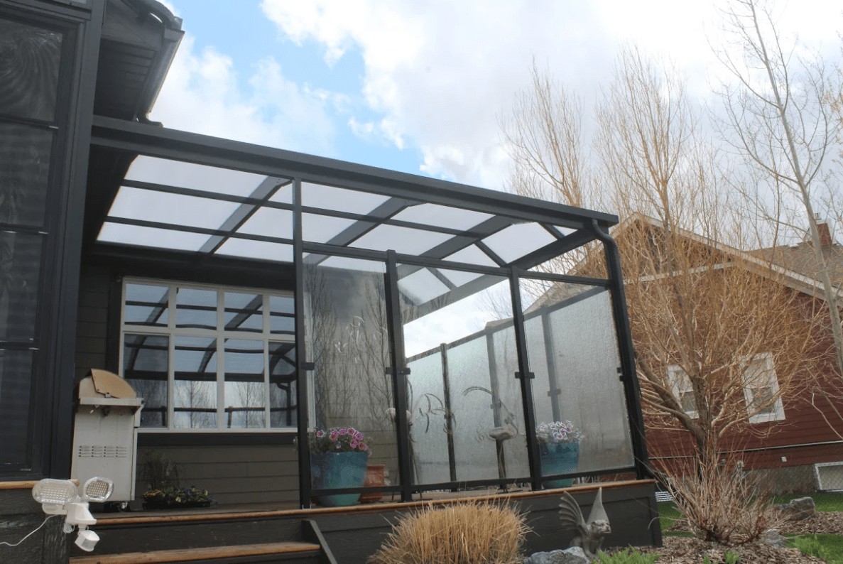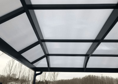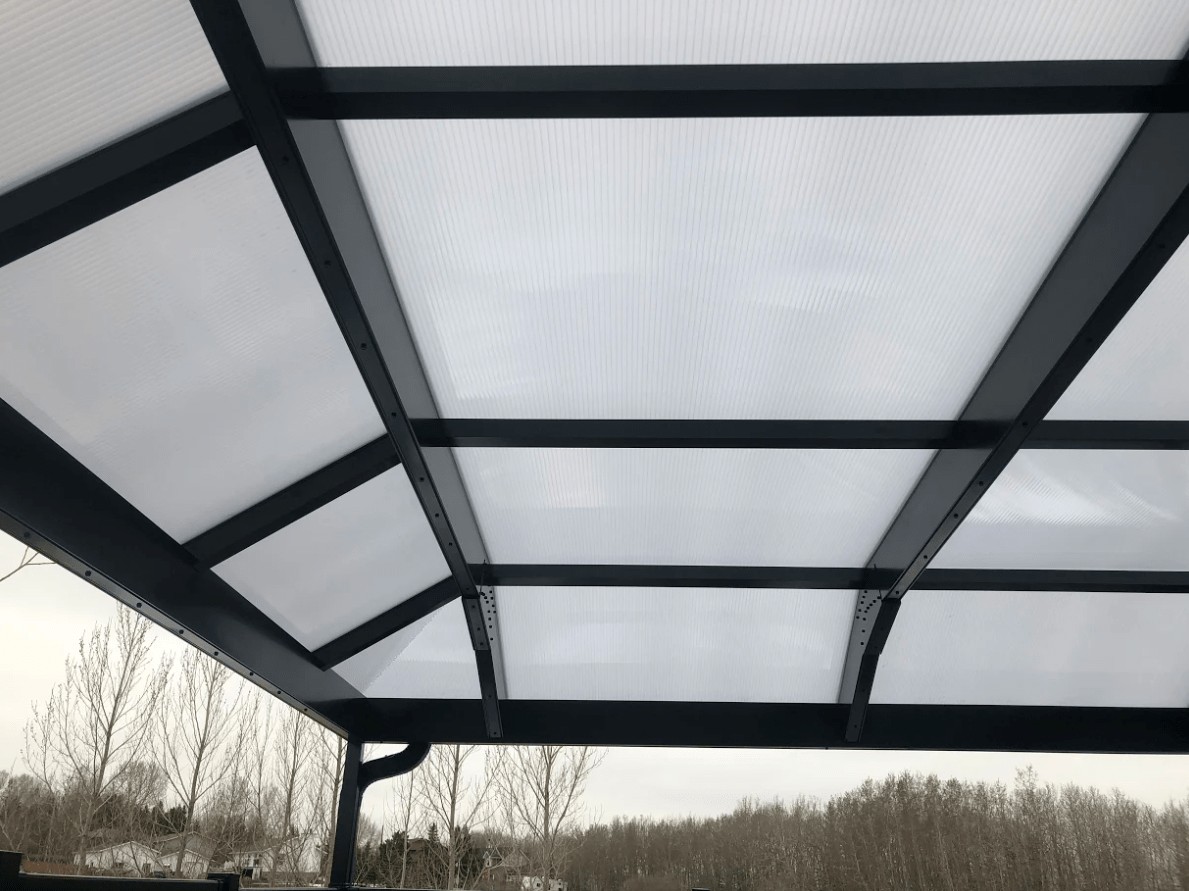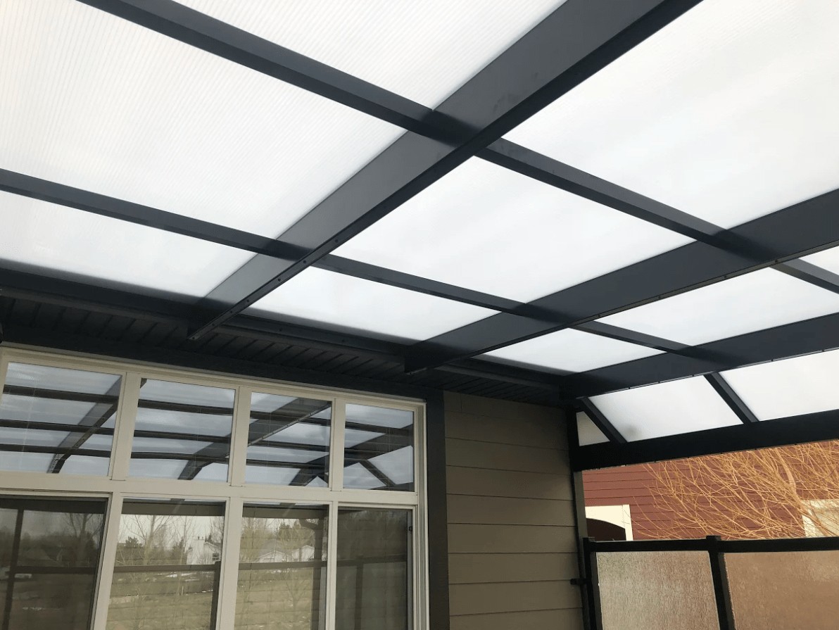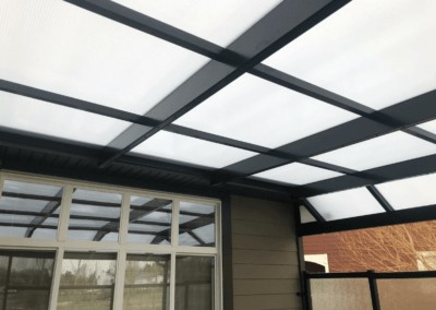 The white polycarbonate roof with black framing will protect from rain and UV rays while allowing light through so they can enjoy the deck without interuption from afternoon storms.