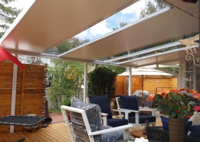 We offer a variety of durable, low-maintenance materials, including V-Pan aluminum, insulated panels, glass, and polycarbonate. Each option has unique benefits, from maximum shade and insulation to light-filtering and modern aesthetics.